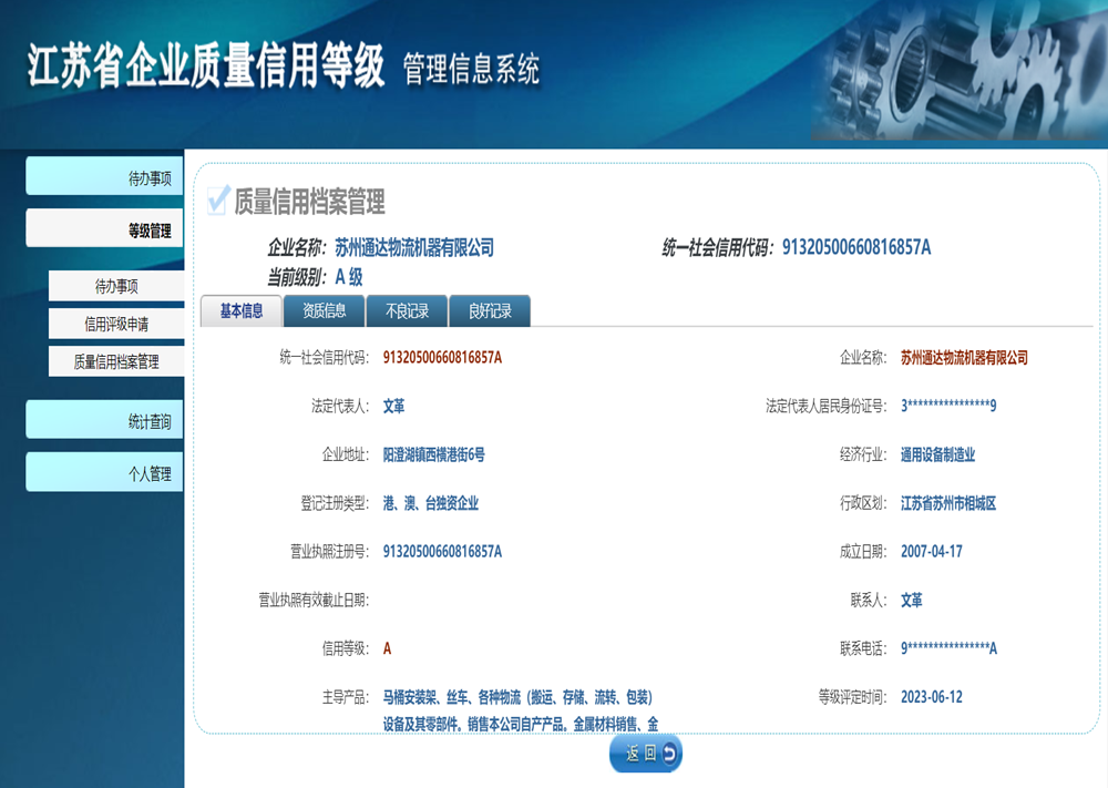 江苏省企业质量信用等级A级